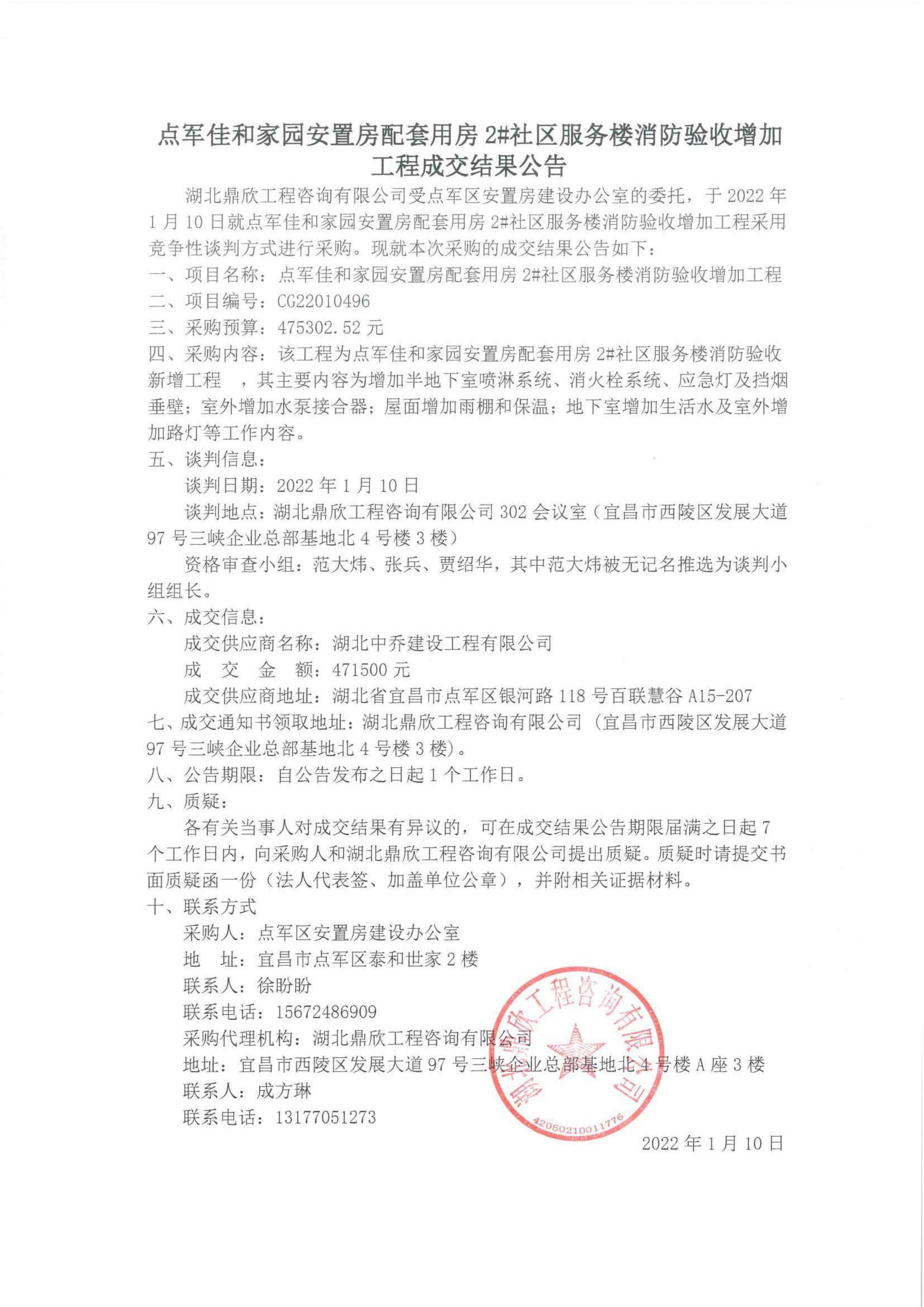 點(diǎn)軍佳和家園安置房配套用房2#社區(qū)服務(wù)樓消防驗(yàn)收增加工程成交結(jié)果公告