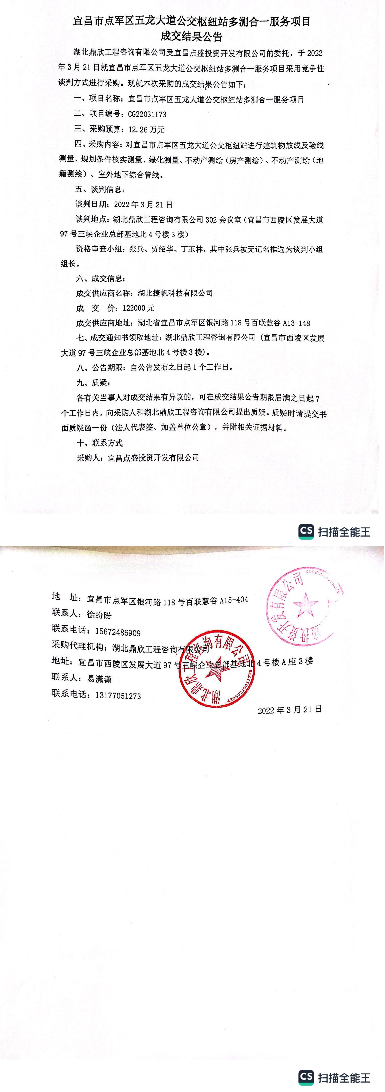 宜昌市點軍區(qū)五龍大道公交樞紐站多測合一服務(wù)項目成交結(jié)果公告