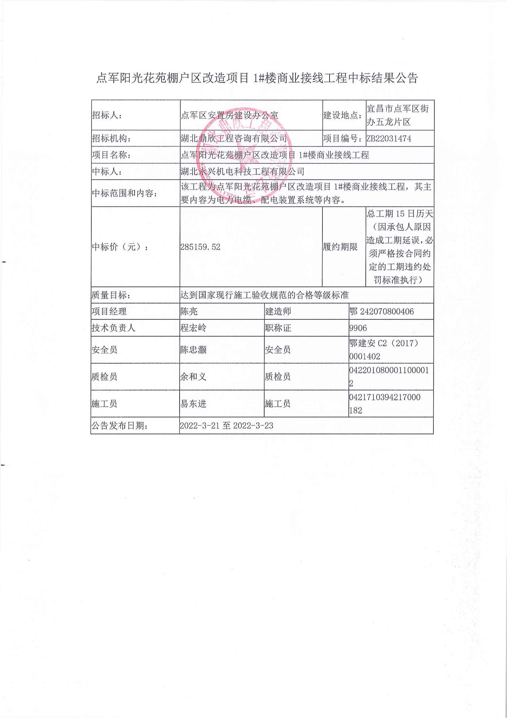 點(diǎn)軍陽光花苑棚戶區(qū)改造項(xiàng)目1#樓商業(yè)接線工程中標(biāo)公告