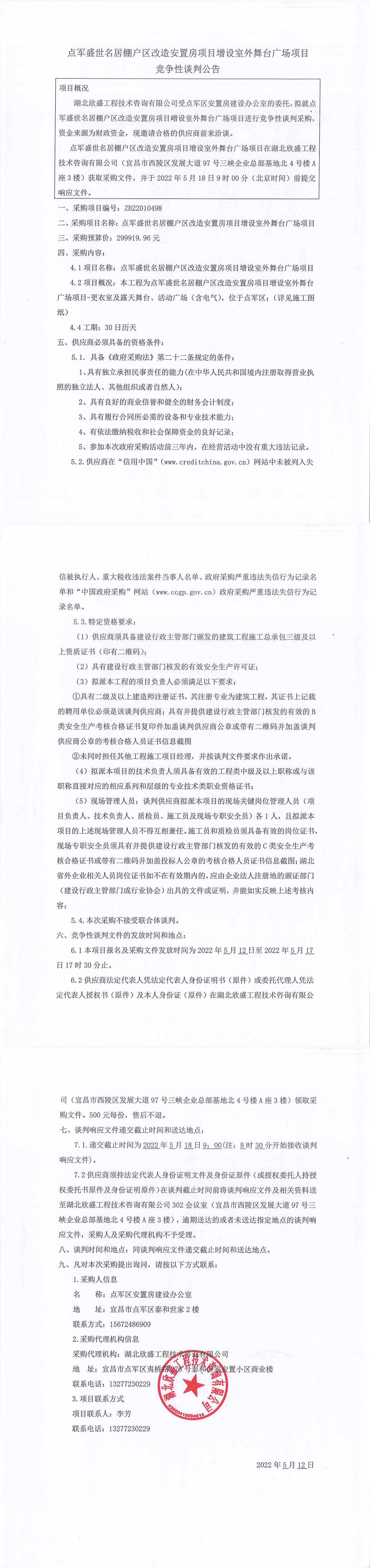 點(diǎn)軍盛世名居棚戶區(qū)改造安置房項(xiàng)目增設(shè)室外舞臺(tái)廣場(chǎng)項(xiàng)目談判公告