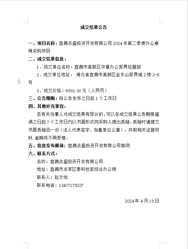 宜昌點(diǎn)盛投資開發(fā)有限公司2024年第二季度辦公桌椅采購項(xiàng)目成交公告