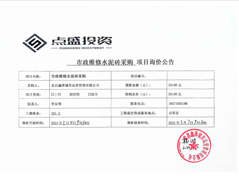 宜昌鑫澤城市運(yùn)營管理有限公司市政維修水泥磚采購項(xiàng)目詢價(jià)公告