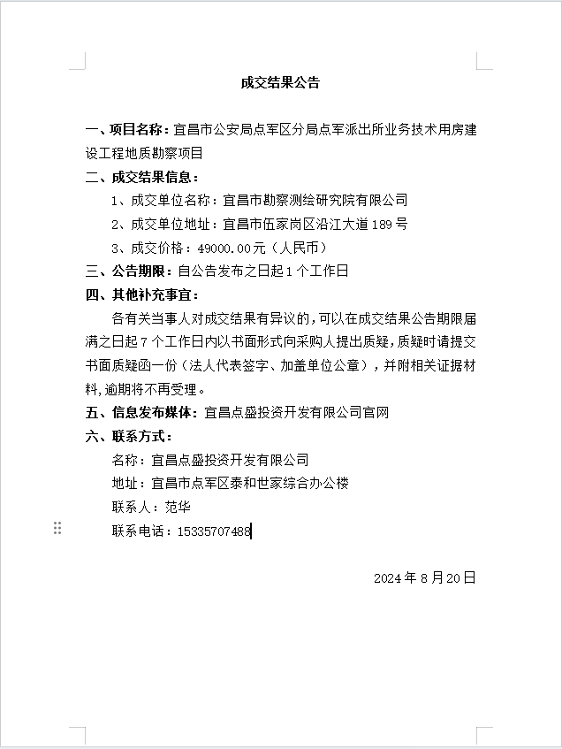 宜昌市公安局點(diǎn)軍區(qū)分局點(diǎn)軍派出所業(yè)務(wù)技術(shù)用房建設(shè)工程地質(zhì)勘察項目成交公告
