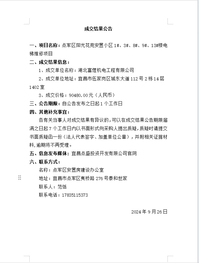 點(diǎn)軍區(qū)陽(yáng)光花苑安置小區(qū)1#、3#、8#、9#、13#樓電梯維修項(xiàng)目成交公告