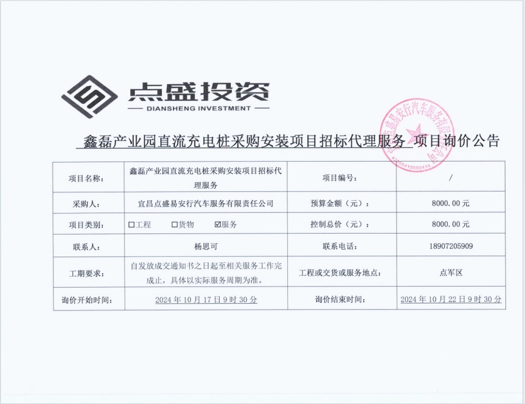 鑫磊產業(yè)園直流充電樁采購安裝項目招標代理服務詢價公告