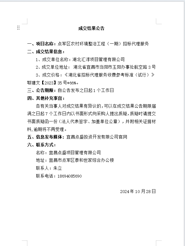 點軍區(qū)農(nóng)村環(huán)境整治工程(一期)招標代理服務成交公告