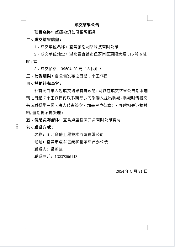 點盛投資公司招聘服務(wù)成交公告